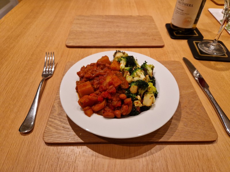 Lamb sausage and potato stew with sauteed broccoli