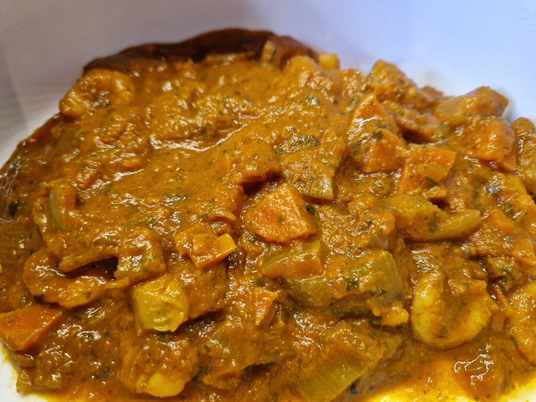 Serves 2. We gave up trying to keep fresh ginger and started buying ginger & garlic paste in jars (those 2 things tend to be used together, so it makes sense). Most other Pathia recipes I looked at called for tinned tomato cooked down for ages or passata – I didn’t want to use a whole tin of tomatoes or open a large carton of passata, so I used a lot of tomato puree and some ketchup (Rubies in the Rubble) and skipped adding 2 Tbsp of sugar. I was adding courgette (because that’s the seasonal veg we have) so, once that cooked down, it took the place of tomato flesh.