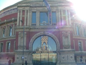 Albert Memorial reflected in the Albert Hall.