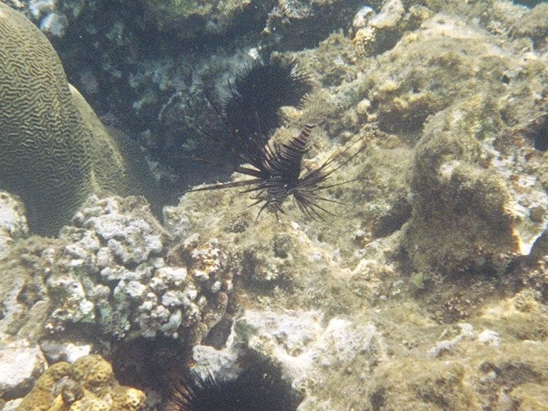 Another Turkeyfish with a sea urchin the background.