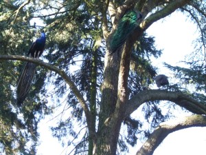 Two peacocks chasing a peahen up a tree!