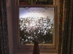 Car headlight shining through our front window